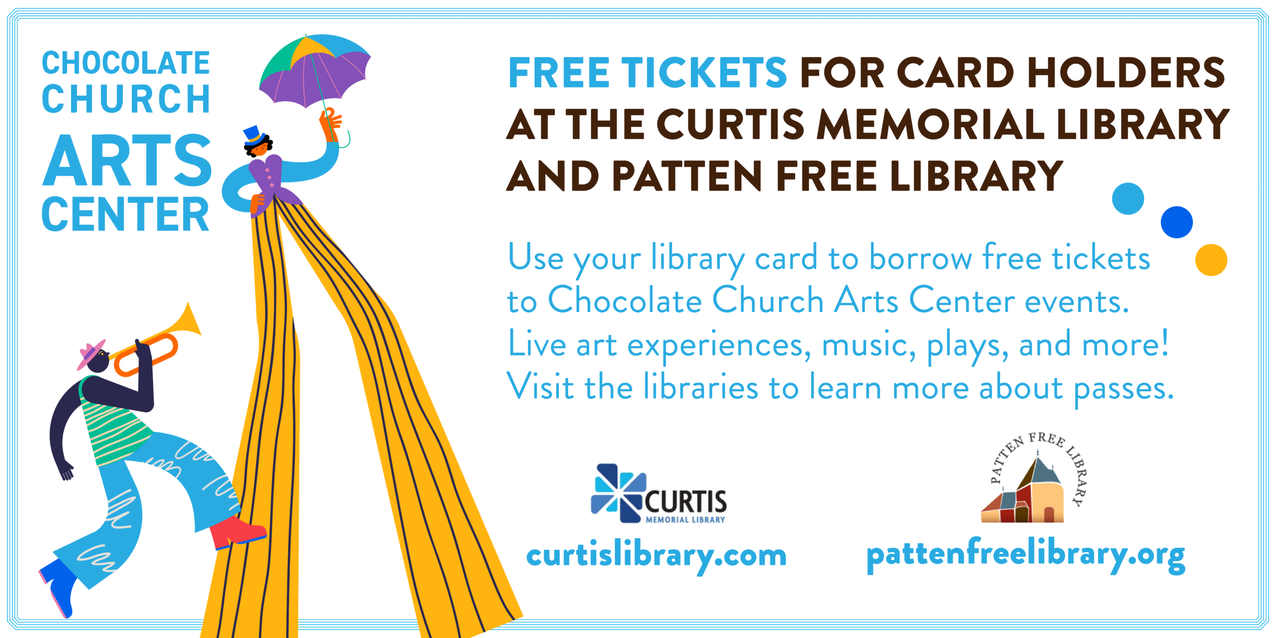 Curtis Memorial Library has three Chocolate Church performance passes available each month from February 2026 through July 2026. Each pass provides the patron with a coupon that allows them to reserve two seats at a show that month for free.